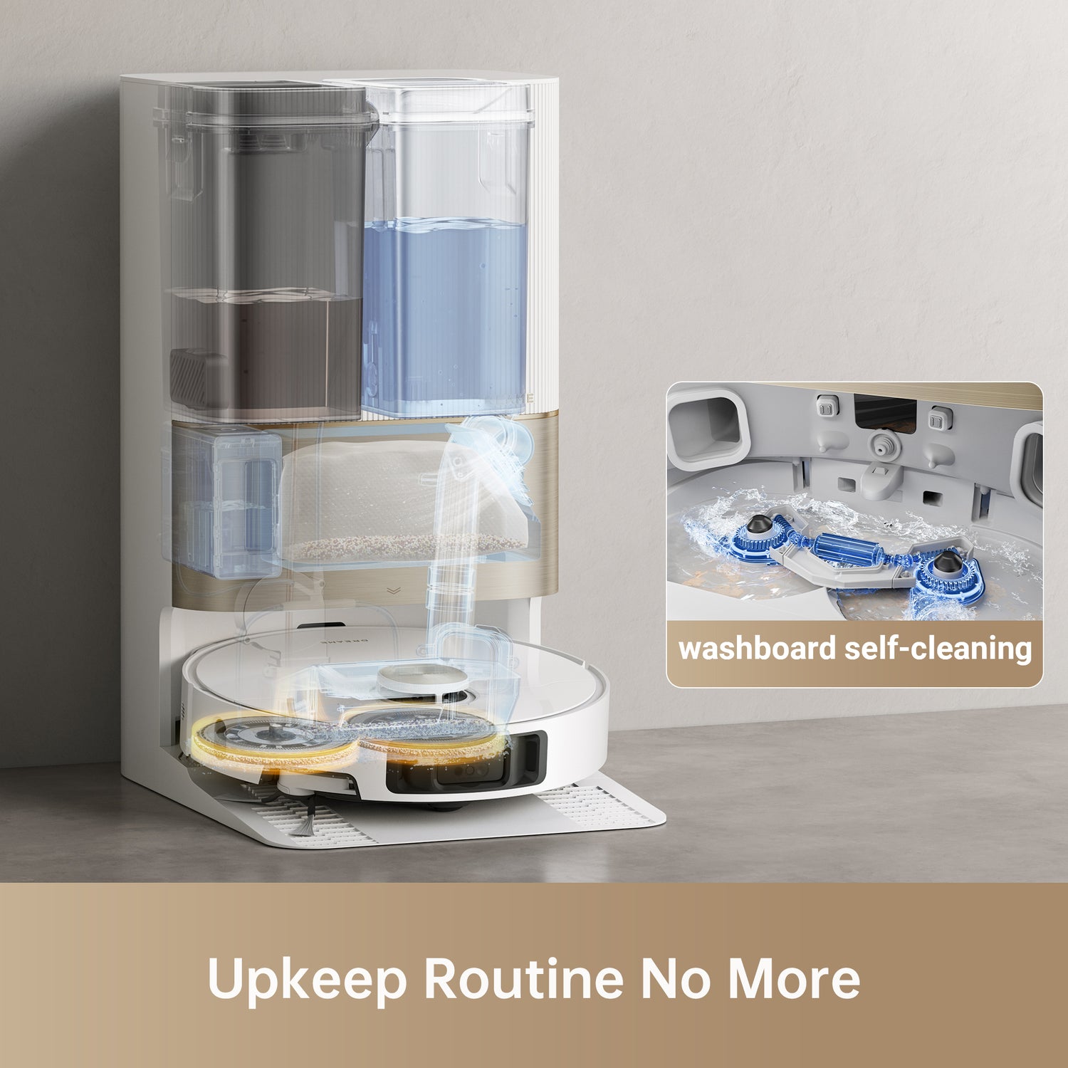 - Automatic Refill/Drain: Base station automatically refills the robot's water tank and drains dirty water