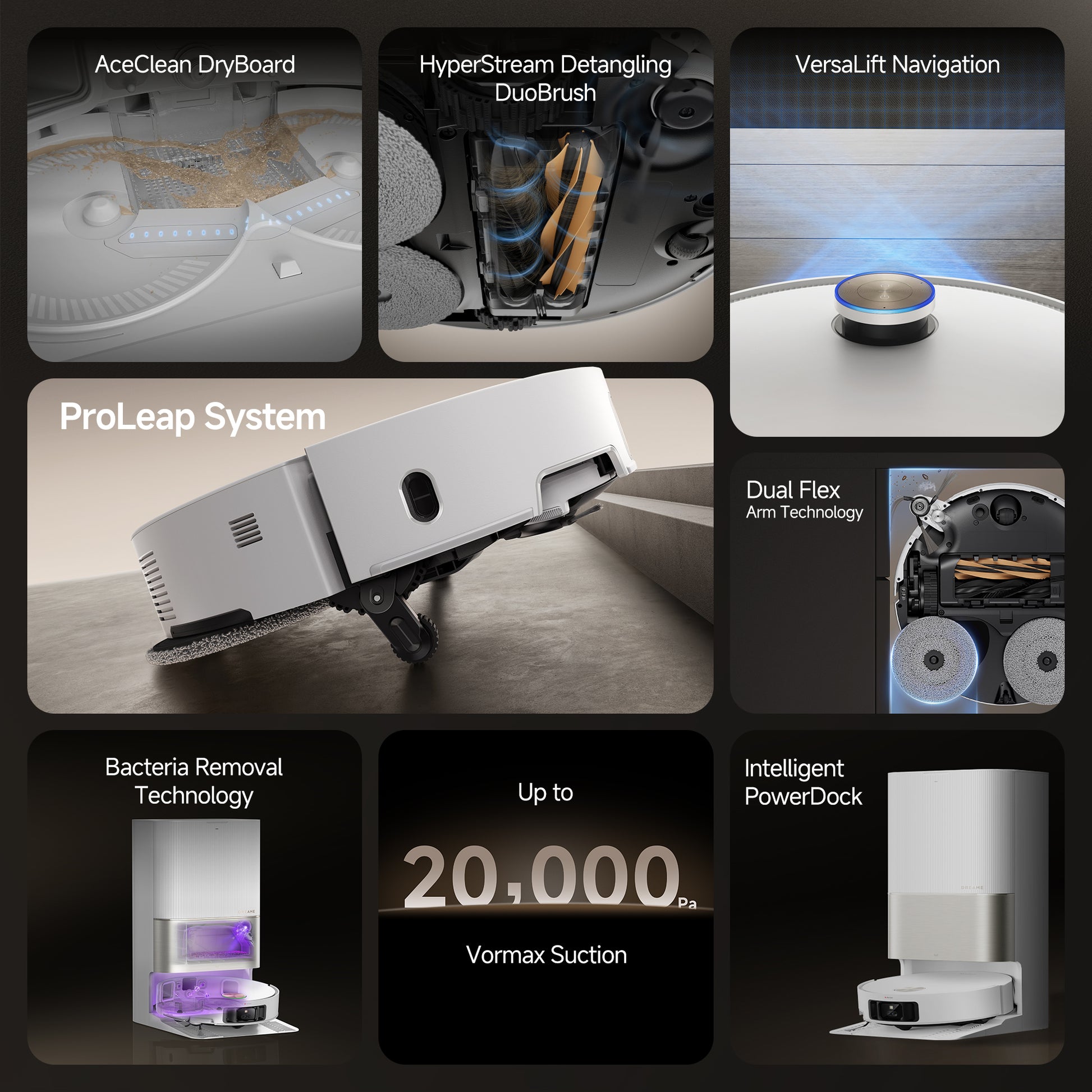 The Dreame X50 Ultra features 20,000Pa suction, ProLeap System with retractable legs to clear obstacles up to 6cm, VersaLift DToF navigation, a 395ml dustbin, and a 6400mAh battery for up to 220 minutes of runtime.It boasts a self-cleaning base station for its mops (using 80°C hot water and hot air drying) and auto-empties dust into a 3.2L bag, all managed via the Dreamehome app with AI RGB + 3D obstacle avoidance.